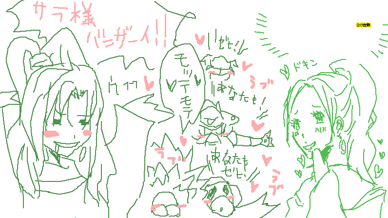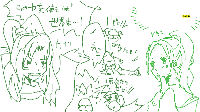 超突発的に絵茶をやりたくなった管理人、とりあえず自サイトの日記ブログに、 「誰か絵茶一緒にやってください」と書いた所、 何と!絵茶の大魔神よしのん(=染井吉野さん)が来て下さいました! という訳で二人でクロノな熱い深夜が過ぎていくのでした…!